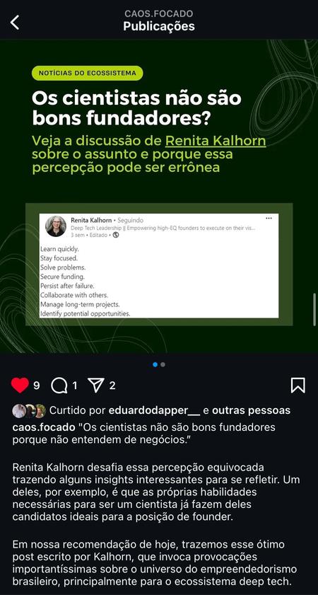 Aqui, pude liderar diversos projetos com muito mais bagagem da experiência anterior, estando mais propositiva e com uma pré-percepção quanto oportunidades de melhoria e de conteúdo, além da construção de novos processos. Nessa experiência, olhei para os canais de Instagram e Linkedin.