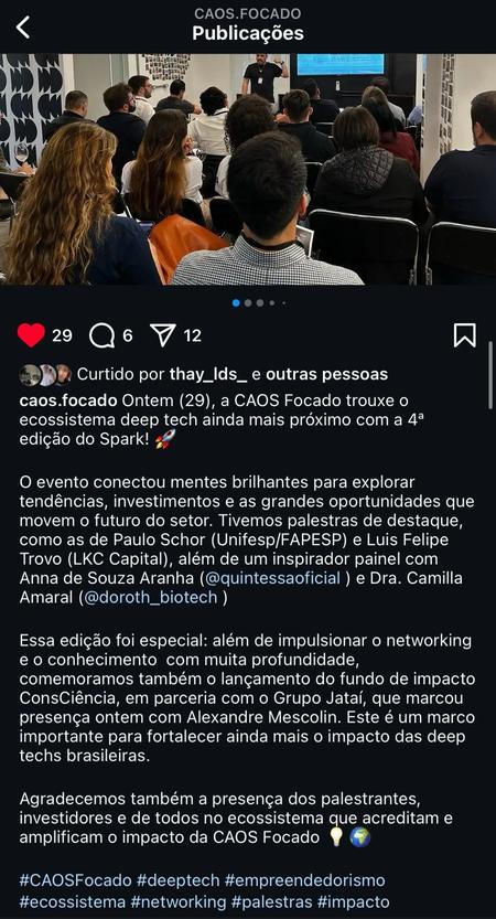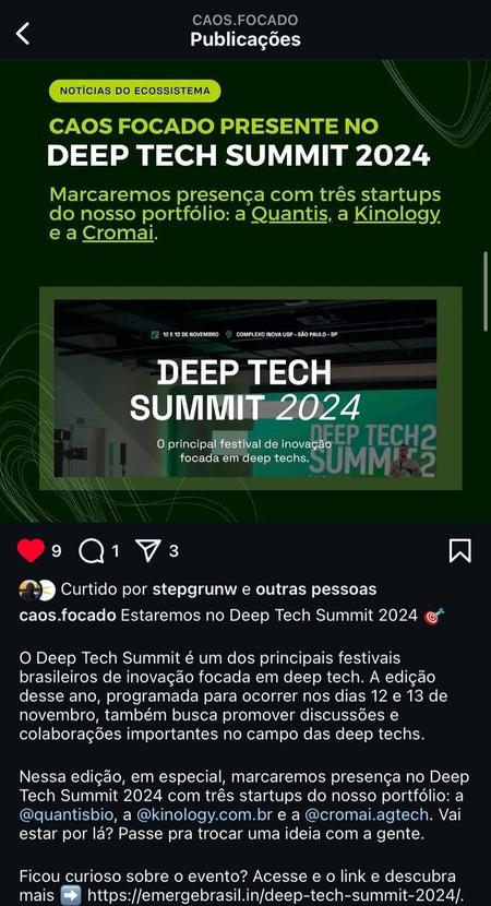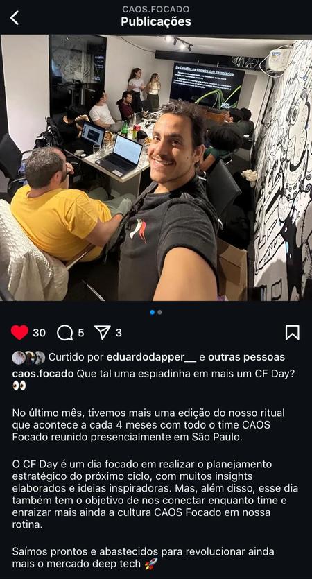 Na CAOS Focado, startup venture builder que olha para o mundo deep tech, eu tinha como responsabilidade gerir a área de Comunicação tanto da Caos Focado quanto de suas ventures (em especial, a Quantis).